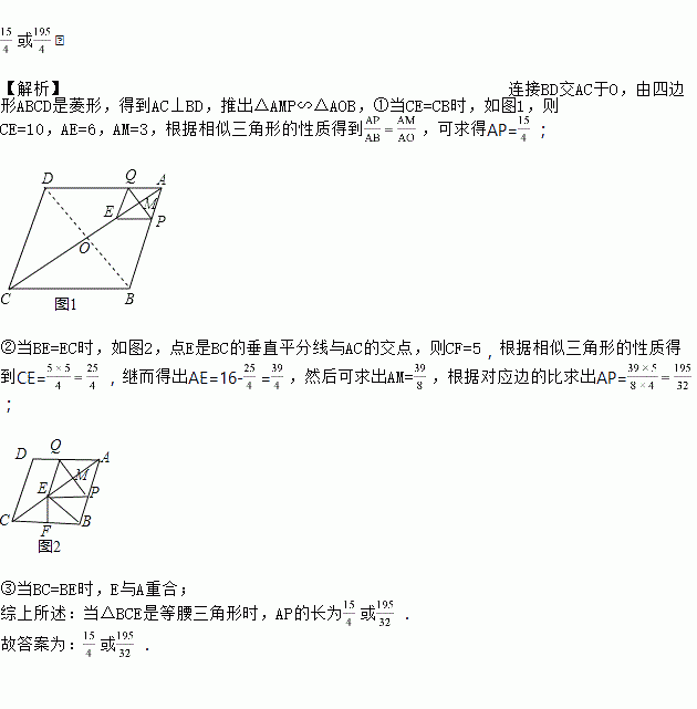 如图,在菱形ABCD中,AB=10,AC=16,点M是对角线AC上的一个动点,过点M作PQ⊥AC交AB于点P,交AD于点Q,将△APQ沿PQ折叠,点A落在点E处,当△BCE是等腰三角形时,AP的长为_____.