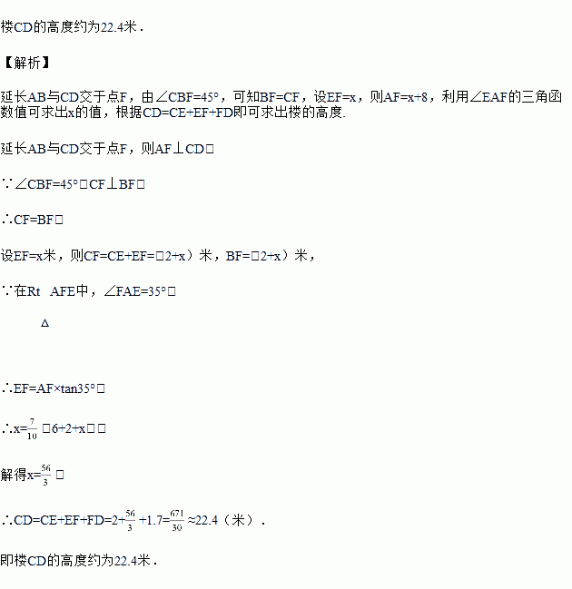 如图,某装修公司要粉刷楼的外墙,需要测量楼CD的高度.已知在楼的外墙上从楼顶C处悬挂一广告屏,其高CE为2米,测量员用高为1.7米的测量器,在A处测得屏幕底端E的仰角为35°,然后他正对大楼方向前进6米,在B处测得屏幕顶端C的仰角为45°.请根据测量数据,求楼CD的高度(参考数据:sin35°≈