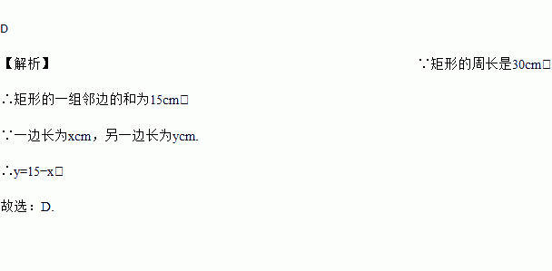 已知长方形的周长为30 cm,一边长为x cm,与其相邻的另一边长为y cm,则y与x之间的函数解析式为( )