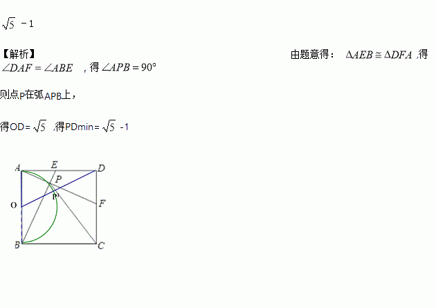 如图,正方形ABCD中,AB=2,动点E从点A出发向点D运动,同时动点F从点D出发向点C运动,点E、F运动的速度相同,当它们到达各自终点时停止运动,运动过程中线段AF、BE相交于点P,则线段DP的最小值为_________