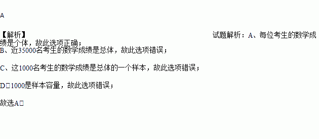 A. 每位考生的数学成绩是个体 B. 近35000名考生是总体