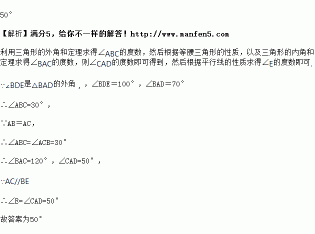 已知:如图,△ABC中,AB=AC,BE∥AC,∠BDE=100°,∠BAD=70°,则∠E=_____________.