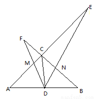 如图,在△ABC中,∠ACB=90°,CD是中线,AC=BC,一个以点D为顶点的45°角绕点D旋转,使角的两边分别与AC、BC的延长线相交,交点分别为E、F,DF与AC交于点M,DE与BC交于点N。