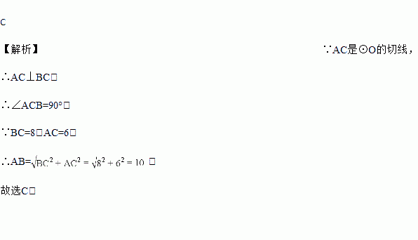 如图,⊙O半径为4,BC是直径,AC是⊙O的切线,且AC=6,那么AB=( )