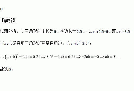 设a、b是直角三角形的两条直角边,若该三角形的周长为6,斜边长为2.5,则ab的值是