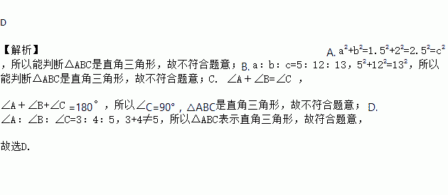 D ¡¾½âÎö¡¿A. a2+b2=1.52+22=2.52=c2£¬ËùÒÔÄÜÅжϡ÷ABCÊÇÖ±½ÇÈý½ÇÐΣ¬¹Ê²»·ûºÏÌâÒ⣻B. a£ºb£ºc=5£º12£º13£¬52+122=132£¬ËùÒÔÄÜÅжϡ÷ABCÊÇÖ±½ÇÈý½ÇÐΣ¬¹Ê²»·ûºÏÌâÒ⣻C. ¡ÏA£«¡ÏB=¡ÏC £¬ ¡ÏA£«¡ÏB+¡ÏC =180¡ã£¬ËùÒÔ¡ÏC=90¡ã£¬¡÷ABCÊÇÖ±½ÇÈý½ÇÐΣ¬¹Ê²»·ûºÏÌâÒ⣻ D. ¡ÏA£º¡ÏB£º¡ÏC=3£º4£º5£¬3+4¡Ù5£¬ËùÒÔ¡÷ABC±íʾ...