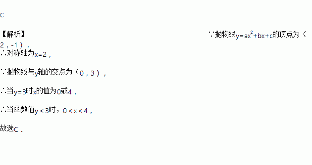 如图,已知抛物线的顶点为(2,-1),抛物线与y轴的交点为(0,3),当函数值时,自变量x的取值范围是( )