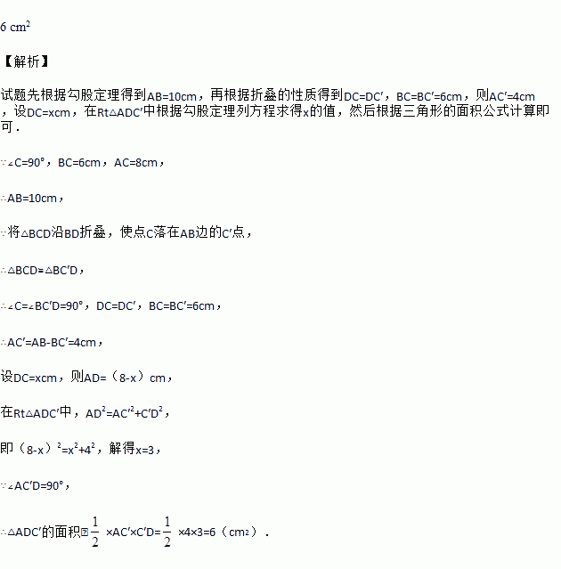 如图,在Rt△ABC中,∠C=90°,BC=6 cm,AC=8 cm,将△BCD沿BD折叠,使点C落在AB边的C′点处,那么△ADC′的面积是________.