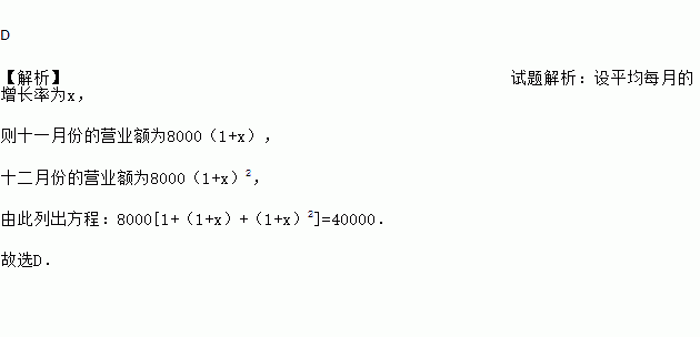 D 【解析】试题解析:设平均每月的增长率为x, 则十一月份的营业额为8000(1+x), 十二月份的营业额为8000(1+x)2, 由此列出方程:8000[1+(1+x)+(1+x)2]=40000. 故选D.