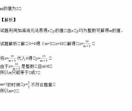 m为正整数,已知二元一次方程组 有整数解,求m的值.