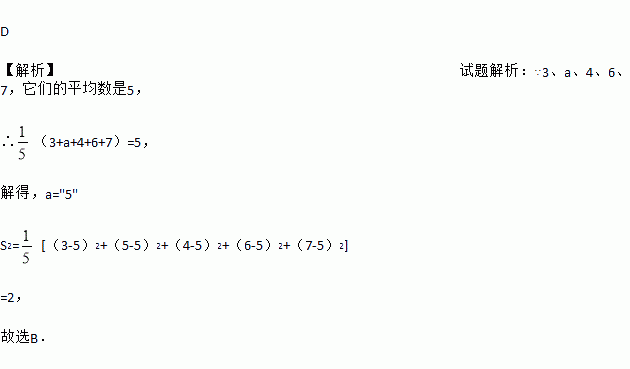 有一组数据如下:3,a,4,6,7,它们的平均数是5,那么这组数据的方差是( )