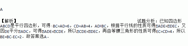如图,在□ABCD中,AD=6,AB=4,DE平分∠ADC交BC于点E,则BE的长是( )
