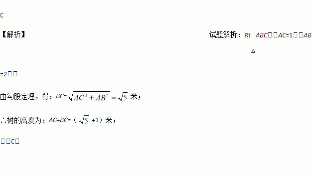 如图,一场暴雨过后,垂直于地面的一棵树在距地面1米处折断,树尖B恰好碰到地面,经测量AB=2m,则树高为( )米