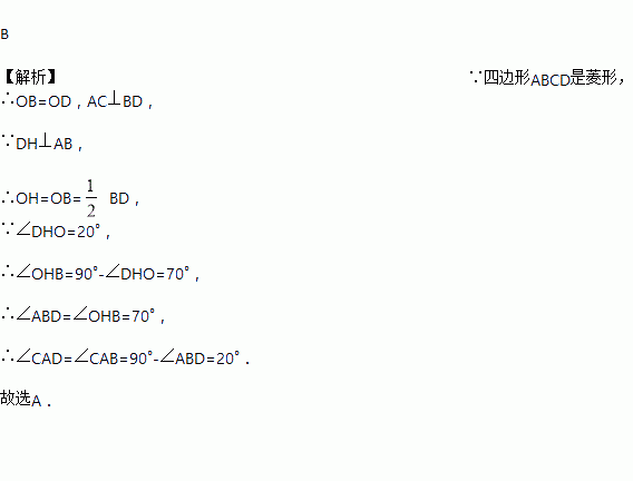 四边形ABCD是菱形,对角线AC,BD相交于点O,DH⊥AB于H,连接OH,∠DHO=20°,则∠CAD的度数是.