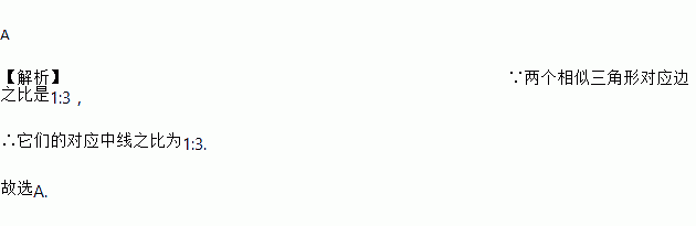 A 【解析】∵两个相似三角形对应边之比是1:3, ∴它们的对应中线之比为1:3. 故选A.