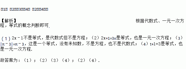 在(1)2x﹣1;(2)2x+1=3x;(3)|π﹣3|=π﹣3;(4)t+1=3中,代数式有_____,等式有_____,方程有_____(填入式子的序号).