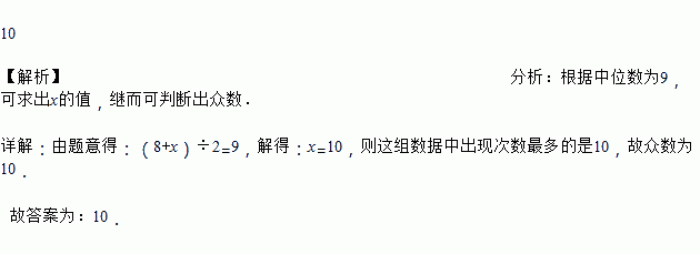 某组数据按从小到大的顺序如下:2、4、8、x、10、14,已知这组数据的中位数是9,则这组数据的众数是_____.