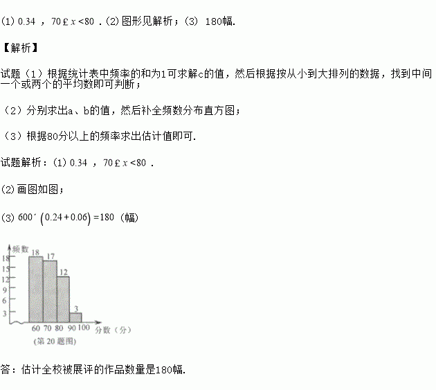 (3)若80分以上(含80分)的作品将被组织展评,试估计全校被展评作品数量是多少?