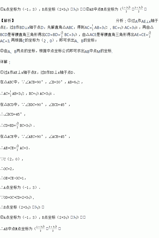 如图,已知ΔABC在坐标平面内的顶点C(2,0),∠ACB=90°,∠B=30°,AB=6,∠BCD=45°。①求A、B的坐标;②求AB中点M的坐标.