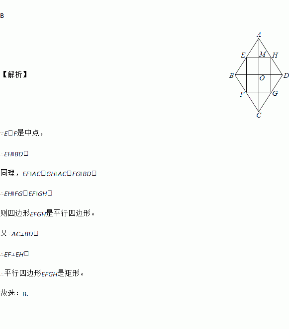 B 【解析】 ∵E,F是中点, ∴EH∥BD, 同理,EF∥AC,GH∥AC,FG∥BD, ∴EH∥FG,EF∥GH, 则四边形EFGH是平行四边形。 又∵AC⊥BD, ∴EF⊥EH, ∴平行四边形EFGH是矩形。 故选:B.