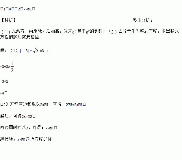 (1)计算:|﹣3|+×3﹣1;(2)解方程: +=1.