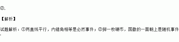 ②. 【解析】 试题解析:①两直线平行,内错角相等是必然事件;②掷一枚硬币,国徽的一面朝上是随机事件.