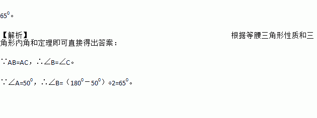 650。 【解析】根据等腰三角形性质和三角形内角和定理即可直接得出答案: ∵AB=AC,∴∠B=∠C。 ∵∠A=500,∴∠B=(1800-500)÷2=650。