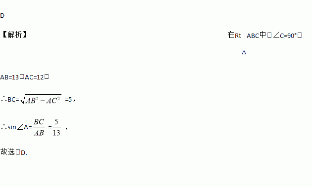 如图,在Rt△ABC中,∠C=90°,AB=13,AC=12,则∠A的正弦值为( )