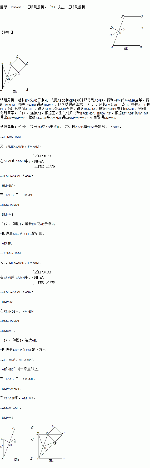 £¨1£©Èô½«¡±²ÂÏëÓëÖ¤Ã÷¡°ÖеÄֽƬ»»³ÉÕý·½ÐÎֽƬABCDÓëÕý·½ÐÎֽƬECGF£¬ÆäËûÌõ¼þ²»±ä£¬ÔòDMºÍMEµÄ¹ØÏµÎª¡¡ ¡¡£®