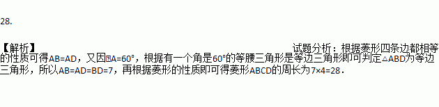 如图,菱形ABCD中,∠A=60°,BD=7,则菱形ABCD的周长为 .