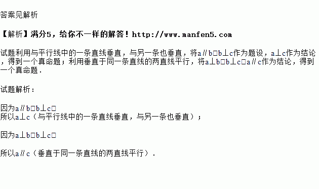 已知a、b、c是同一平面内的3条直线,给出下面6个命题:a∥b, b∥c,a∥c ,a⊥b,b⊥c,a⊥c,请从中选取3个命题(其中2个作为题设,1个作为结论)尽可能多地去组成一个真命题,并说出是运用了数学中的哪个道理。举例如下: