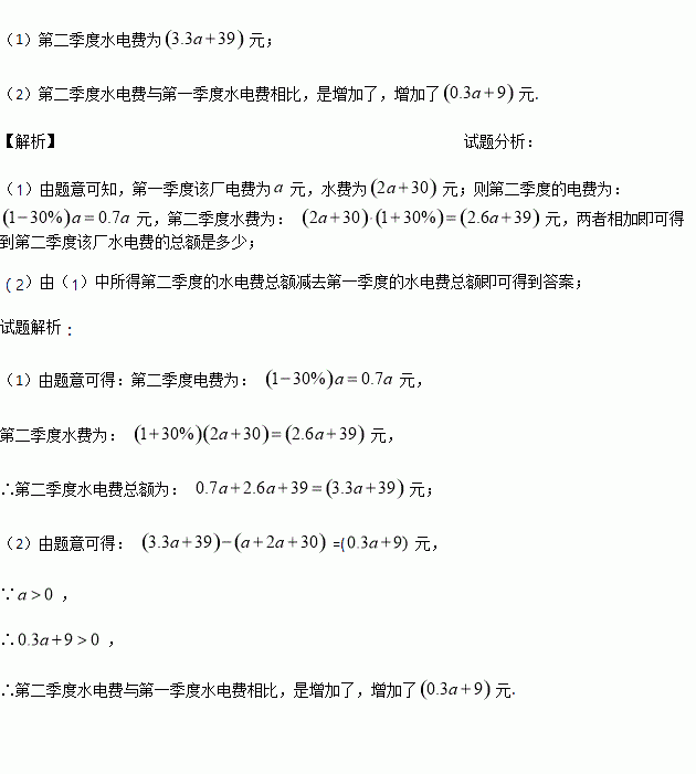 元,水费比电费的2倍多30元.第二季度电费比第一季度节约了30%,水费比第一季度多支出了30%.