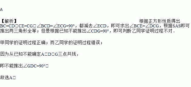 已知正方形ABCD,点E在边AB上,以CE为边作正方形CEFG,如图所示,连接DG.求证:△BCE≌△DCG.甲、乙两位同学的证明过程如下,则下列说法正确的是( )