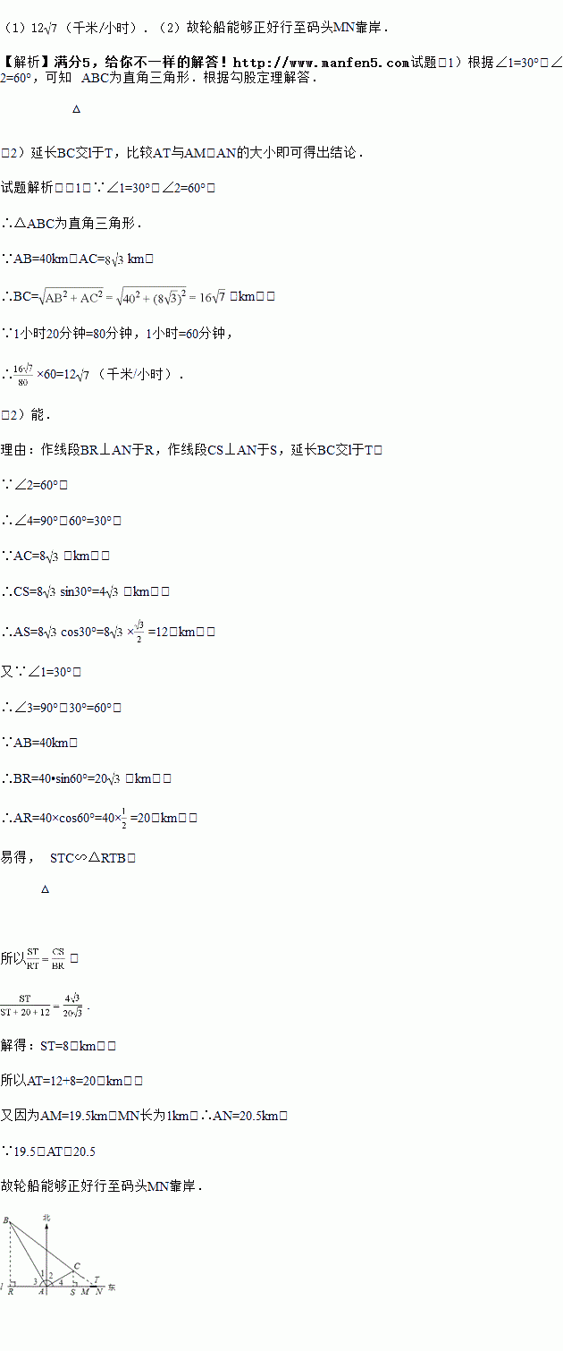 (2)如果该轮船不改变航向继续航行,那么轮船能否正好行至码头MN靠岸?请说明理由.