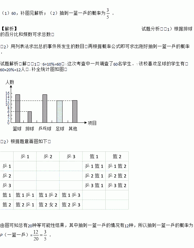 (2)被调查同学中恰好有5名学来自初一12班,其中有2名同学选择了篮球,有3名同学选择了乒乓球,曹老师打算从这5名同学中选择两同学了解他们对体育社团的看法,请用列表法或画树状图法,求选出的两人恰好为一人选择篮球、一人选择乒乓球的概率.