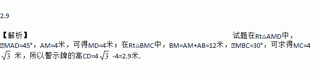 如图是矗立在高速公路水平地面上的交通警示牌,经测量得到如下数据:AM=4米,AB=8米,∠MAD=45°,∠MBC=30°,则警示牌的高CD为_米.(结果精确到0.1米,参考数据: