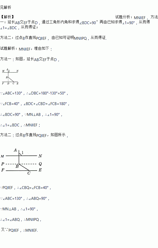 如图,已知MN⊥AB,∠ABC=130°,∠FCB=40°,试判断直线MN与EF的位置关系,并说明理由.(至少用两种方法说明)