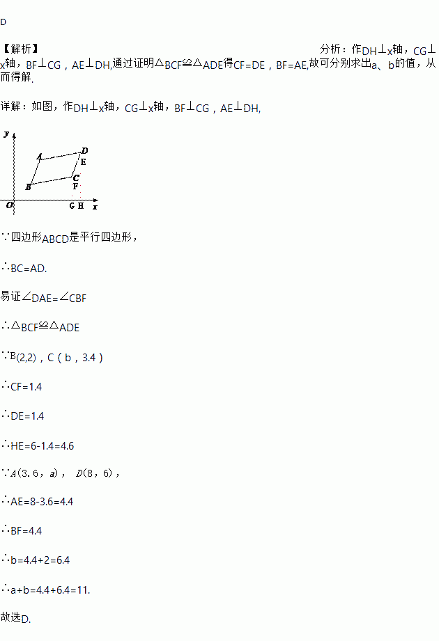如图,在平面直角坐标系中,□ABCD的顶点坐标分别为A(3.6,a),B(2,2),C(b,3.4),D(8,6),则的值为( )![]()