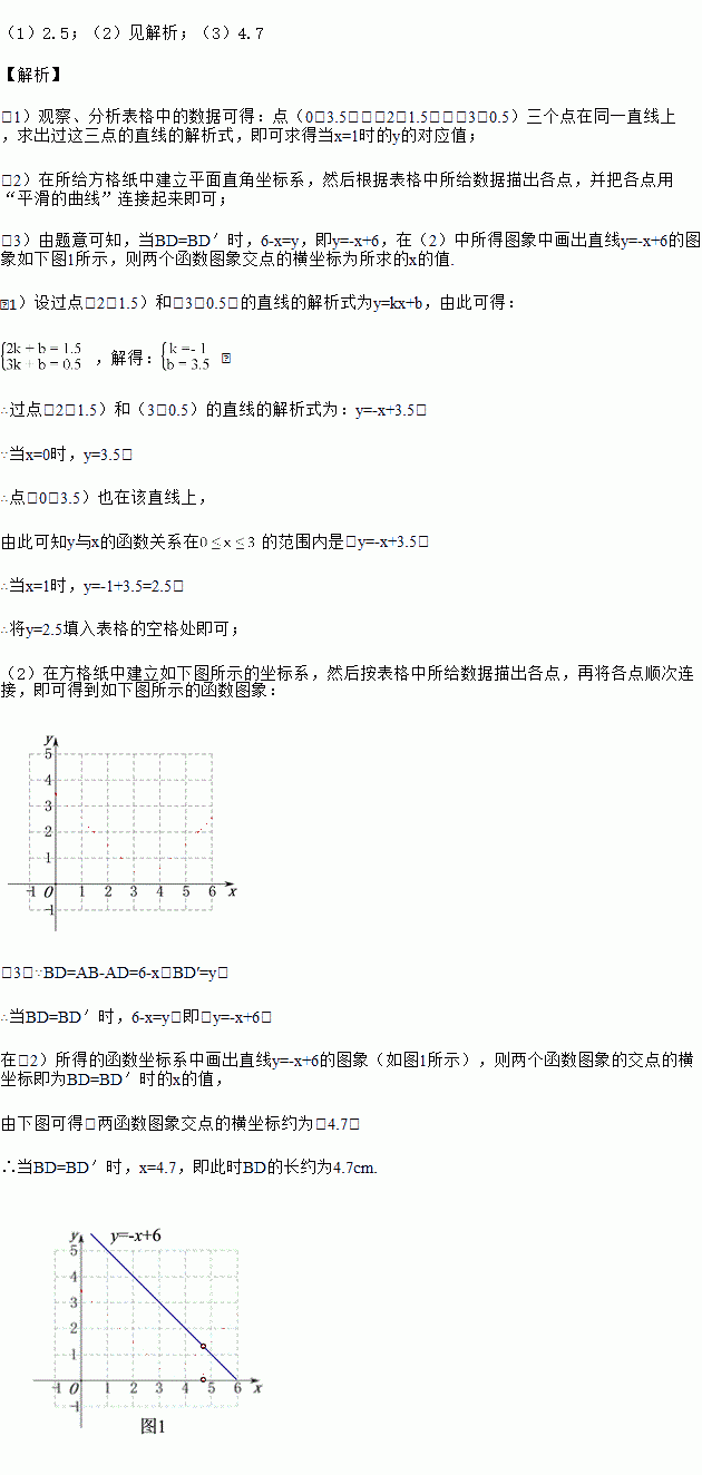 (3)结合画出的函数图象,解决问题:当BD=BD'时,线段AD的长度约为_________.![]()