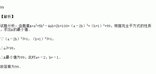 若A=a2+5b2﹣4ab+2b+100,则A的最小值是 .