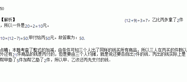 甲、乙、丙三人拿出同样多的钱,合伙订购了同样规格的若干件小饰品,小饰品买来后,甲、乙分别比丙多拿了12件、9件小饰品,最后结算时,乙付给 丙20元,那么甲应付给丙__________元.