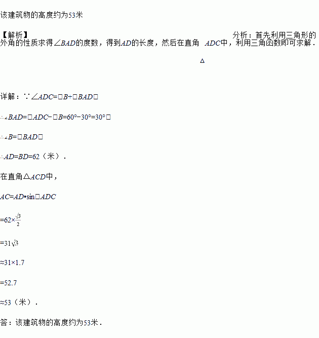 某中学九年级数学兴趣小组,在广场上测量位于正东方向的某建筑物AC的高度,如图所示,他先在点B测得该建筑物顶点A的仰角为30°,然后向正东方向前行62米,到达D点,再测得该建筑物顶点A的仰角为60°(B、C、D三点在同一水平面上,且测量仪的高度忽略不计).求该建筑物AC的高度(结果精确的1米,参考数值: