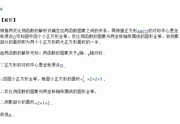 边长为的正方形的对称中心是坐标原点,轴,轴,反比例函数与的图象均与正方形的边相交,则图中的阴影部分的面积是( )
