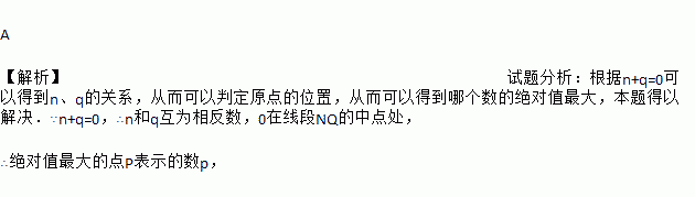 如图,四个实数m,n,p,q在数轴上对应的点分别为M,N,P,Q.若n+q=0,则m,n,p,q四个实数中,绝对值最大的一个是( )