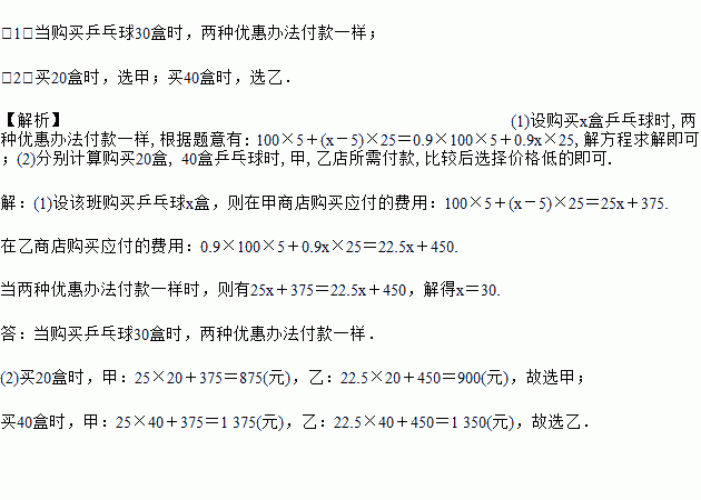 (1)当购买乒乓球30盒时,两种优惠办法付款一样; (2)买20盒时,选甲;买40盒时,选乙. 【解析】(1)设购买x盒乒乓球时,两种优惠办法付款一样,根据题意有: 100×5+(x-5)×25=0.9×100×5+0.9x×25,解方程求解即可;(2)分别计算购买20盒, 40盒乒乓球时,甲,乙店所需付款,比较后选择价格低的即可. 【解析】 (1)设该班购买乒乓球x盒,则在甲...