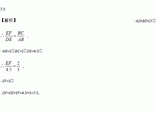如图,点B,E分别在线段AC,DF上,若AD∥BE∥CF,AB=3,BC=2,DE=4.5,则DF的长为____.