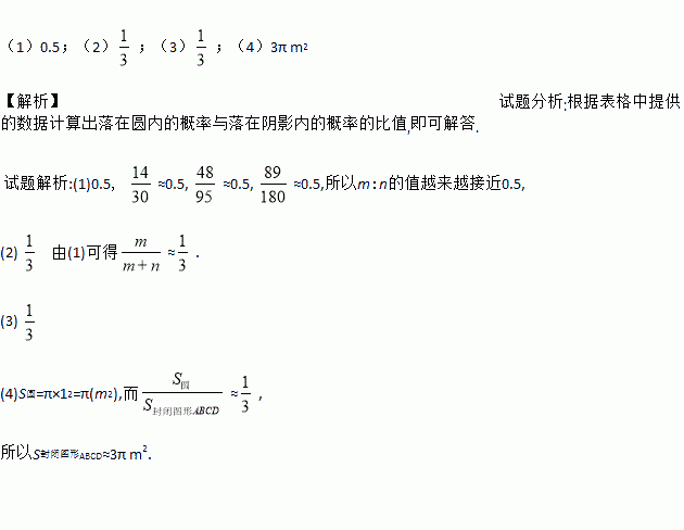 (4)请你利用(2)中所得频率,估计整个封闭图形ABCD的面积是多少平方米(结果保留π).