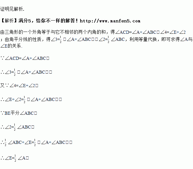 (本题6分)如图:∠ACD是△ABC的外角,BE平分∠ABC,CE平分∠ACD,且BE、CE交于点E,求证:∠E=∠A.