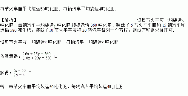 运输 360 吨化肥,装载了 6 节火车车厢和 15 辆汽车,运输 580 吨化肥,装载了10 节火车车厢和 20 辆汽车,每节火车车厢和每辆汽车平均各装多少吨化肥?
