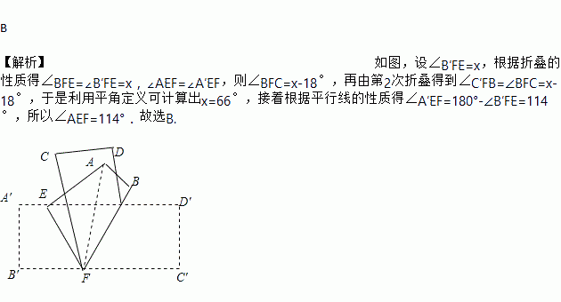 如图1是AD∥BC的一张纸条,按图1→图2→图3,把这一纸条先沿EF折叠并压平,再沿BF折叠并压平,若图3中∠CFE=18°,则图2中∠AEF的度数为( )![]()